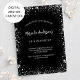 Um fundo na moda preto. Decorado com falso brilho prateado, faíscas. Personalize e adicione um nome, idade e detalhes da festa. O nome é escrito com um script de estilo manuscrito