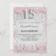 Um convite moderno, na moda e glamouroso para a Quinceañera, festa de aniversário 15. Um fundo de aspecto fino prateado, decorado com pó brilhante de prata rosa e falso. Personalize e adicione o seu nome e detalhes da festa. O número 15 é escrito com uma fonte de estilo balão, script.