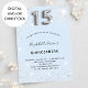Um convite moderno, na moda e glamouroso para a Quinceañera, festa de aniversário 15. Um fundo azul bebê, decorado com pó cintilante de prata suja. Personalize e adicione o seu nome e detalhes da festa. O número 15 é escrito com uma fonte de estilo balão, script.