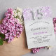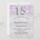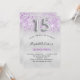Um convite moderno, na moda e glamouroso para a Quinceañera, festa de aniversário 15. Um fundo metálico falso prateado com um elegante brilho púrpura, manchas. O nome é escrito com um moderno estilo escrito à mão. Personalize e adicione os detalhes da sua festa. O número 15 é escrito com uma fonte de estilo balão, script.