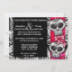 Belo design geométrico geométrico preto e branco com sotaques rubis vermelhos por trás de um crânio de açúcar do Dia de los Muertos. Facilmente personalizável para suas informações de casamento. Anuncie sua celebração de casamento com orgulho e gosto.