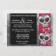 Belo design geométrico geométrico preto e branco com sotaques rubis vermelhos por trás de um crânio de açúcar do Dia de los Muertos. Facilmente personalizável para suas informações de casamento. Anuncie sua celebração de casamento com orgulho e gosto.