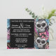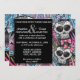 Belo design geométrico tribal, rosa e azul, com sotaques brilhantes atrás de um crânio de açúcar do Dia de los Muertos. Facilmente personalizável para suas informações de casamento.