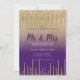 Uma caligrafia audaz roxa, lavanda escrita à mão, chamada de artista moderna MR. MRS com tipografia roxa e dourada goteja convites de casamento gradientes.