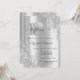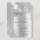 Um convite moderno, chique e glamouroso com brilho pingado num fundo prateado.