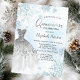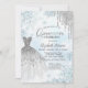 Vestido elegante de prata, pingos de brilho prateado e flocos de neve.