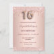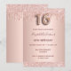 Um convite moderno, na moda e glamouroso para a 16ª festa de aniversário doce de uma menina. Um fundo metálico rosa dourado falso com um brilho elegante rosa dourado, pintura gota-a-gota. O nome é escrito com um moderno e escuro, rosa dourado, escrito com letra de estilo manuscrito. Personalize e adicione os detalhes da sua festa. O número 16 é escrito com uma fonte de estilo de balão, script.