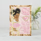 Este é um convite para chás de fraldas moderno e elegante Fitas e Arcos Diamantes e Pérolas Rapariga Americana Africana vestindo festa rosa-pincel e vestido de festa dourada. Cabelo De Tom Escuro Da Pele: Afro Puff Curly
