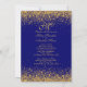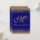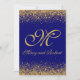 Um convite moderno e elegante, com os nomes da noiva e do noivo em ouro profundo, sobre um rico fundo azul real, coberto de um confete dourado. A placa se reverte para o texto em um grande retângulo azul enquadrado em brilho dourado. Você pode personalizá-lo completamente clicando no link personalizar. Isso faz parte de uma suíte de casamento luxuosa que inclui muito mais essencial.