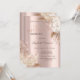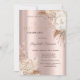 Um convite moderno, chique e glamoroso com gotas de glitter e flores boho em um fundo rosa dourado.