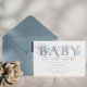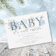 Querida, está frio lá fora! Este elegante convite para chás de fraldas apresenta um tema de Maravilha de inverno. Tem um BABY acentuado com aquarela azul e prateada e flocos de neve com brilho prateado.
