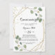 Este convite de Quinceañera, que brilha a ouro, é perfeito para uma simples festa de aniversário de 15. O design apresenta ramificações botânicas verdes de eucalipto desenhadas à mão e folhas enfeitando uma moldura geométrica dourada com brilho.