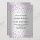 Um convite moderno, na moda e glamouroso para a festa de aniversário (ou qualquer idade) de uma mulher. Um fundo metálico falso prateado com gotas de brilho púrpura. O nome é escrito com um script estilo preto moderno, escrito à mão. Personalize e adicione um nome, idade e detalhes da festa.