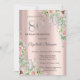 Um convite moderno, chico e glamouroso com pingos de brilho e rosas sobre fundo de ouro rosa.