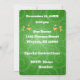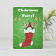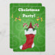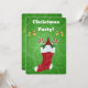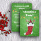 Este convite de festas é verde com um padrão de espiral e uma estocagem de Natal aparada com pele vermelha com um gnomo bonitinho de barba em um dentro de chapéu vermelho junto com folhas sagradas, bagas vermelhas e canas doces. Mais folhas e bagas de cor amarela estão em cada lado. Personalize suas informações na frente e atrás com os modelos.