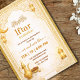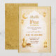 An Iftar dinner invitation, in white and gold, with watercolor food items of iftar. The card is easy to customize with your wording, font, font color, paper shape options, and choice of paper types. The brown and golden watercolor lanterns look stunning on the front while the glittery contrasting backside makes this iftar party invitation truly unique.