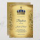 Gold baptism invitation with an ornate design, featuring a blue crown at the top. Elegant script text conveys a formal and celebratory tone.