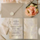The abstract marble design offers a polished alternative to traditional floral wedding stationery, making it ideal for luxury, ballroom, formal, and black-tie weddings. Soft beige tones blended with shimmering gold accents create a warm yet glamorous look that feels timeless, elegant, and effortlessly refined. The balanced composition ensures the metallic details enhance the design without overpowering it.