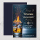 A modern design featuring a gold whiskey glass with burning fire, sparks and ice and elegant calligraphy on a dark blue background. Customize the details for a cool Birthday Celebration.