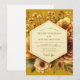 Embrace a radiant aesthetic with this stunning artistic design, featuring a vibrant palette of marigold, amber, and rich gold. Lush, painterly blossoms with delicate petals and verdant leaves are beautifully arranged to create an opulent botanical display. The luminous quality of the artwork lends a romantic and elegant feel, perfect for a sophisticated autumnal union.