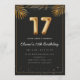 Adorable 17th birthday party invitation in a black and gold balloons design with golden tropical palm leaves. Customize with your party details and mail out to family and friends inviting them to celebrate the 17th birthday with style!