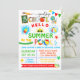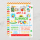 Festa de Piscina do final do ano escolar Convidar, esquema de cores primárias adequado para qualquer idade. Para alterações adicionais (cor da fonte, estilo da fonte, remover ou mover elementos, alterar outros termos *as palavras ESCOLA e PISCINA não são editáveis), clique em personalizar, role para baixo e clique no link "Editar usando a ferramenta Design".
