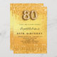 Um convite moderno, na moda e glamouroso para uma festa de aniversário 80. Um fundo metálico de ouro falso com pingos de brilho falso, aparência de pingar tinta. O nome é escrito com um moderno estilo escrito à mão. Personalize e adicione os detalhes da sua festa. O número 80 é escrito com uma fonte de estilo balão, script.
