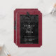 Transport your guests to a world of dark, enchanting elegance with our vintage gothic keystone corner wedding invitation. The deep, aged burgundy red background sets the stage for a striking contrast, as bold white text emerges from intricate black text boxes. At the pinnacle of this invitation, a three-dimensional gothic border adorned with a regal black raven captures the essence of mystery and romance. The back is adorned with two intertwining vines of black roses subtly forming a heart around two embracing ravens, which adds a touch of dramatic allure. Unleash the magic and set the tone for an unforgettable wedding day. Created by Simply Farmhouse Press.