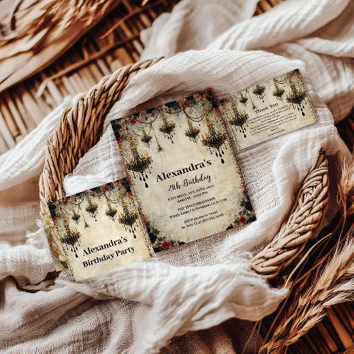 A richly detailed gothic birthday design featuring vintage chandeliers, deep red roses, delicate spiderwebs, and dramatic warm sepia tones that create an opulent, dark-romantic atmosphere. Perfect for anyone who loves moody elegance, Victorian aesthetics, and luxurious gothic style. Easily customize the text for any age, theme, or celebration.