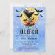 Gothic Spooky A Tini Bit Antigo Convite de aniversário - Apresentando uma bebida preta num copo de martini enfeitado com crânios e abóboras laranja. Os morcegos negros voam ao redor e uma lua de areia amarela cheio está no fundo. Um céu estrelado, místico e celestial azul e roxo é o pano de fundo para este convite de aniversário de vibrações pervertidas, góticos. Todo texto é editável. Disponível como download digital instantâneo, perfeito para envio via texto, e-mail ou mídia social.