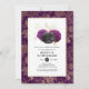 As madrinhas góticas roxas, pretas e douradas lançam um convite com rosas e um fundo úmido com um padrão de aranha ornamentado inverso.