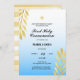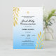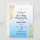 Compartilhe a benção e comemore a Primeira Comunhão do seu filho em estilo com nosso convite para na moda. Este design apresenta ilustrações de aquarela de folhas de ouro, uma cruz de ouro e um roteiro de caligrafia sobre um fundo de gradiente azul. Personalize com seus próprios detalhes ou texto personalizado.