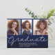 Convite de festa de formatura com uma fonte de script elegante e suas 3 fotos em um fundo azul marinho de ombre. A parte de trás é marinho azul com texto branco, mas completamente personalizável com a ferramenta design do Zazzle.