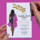 Mulher Festa de formatura africana americana Convidando mulher a desenhar um vestido preto, boné e vestido cor-de-rosa, cabelos escuros longos. classe de balões de ouro 2024.
