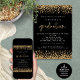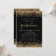 Convite para Graduação Dourada Glitter Preta Imprimível. Disponível digitalmente e impresso. As bordas de confete de falso ouro elegantes estão no topo e no fundo e também no verso. A graduação é feita no estilo moderno de escrita manual. Personalize facilmente o resto do texto para você.