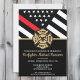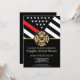 Este design apresenta uma bandeira de bombeiros com listras pretas e brancas, e uma fina faixa vermelha também. Um crachá de bombeiro está sentado acima de todos os detalhes da festa para o bombeiro graduado. Esta design também trabalha excelente para um bombeiro aposentado, tenente, ou festa de aposentadoria do chefe.