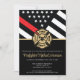 Este design apresenta uma bandeira de bombeiros com listras pretas e brancas, e uma fina faixa vermelha também. Um crachá de bombeiro está sentado acima de todos os detalhes da festa para o bombeiro graduado.