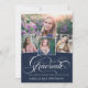 Um convite moderno para a graduação, com a palavra "formando" na frente, em caligrafia por na moda, além de 4 fotos de seu mais velho favorito. Adicione seus próprios detalhes pessoais de celebração às costas. Esta é a versão azul do marinho.