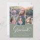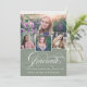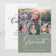 Um convite moderno para a graduação, com a palavra "formando" na frente, em caligrafia por na moda, além de 4 fotos de seu mais velho favorito. Adicione seus próprios detalhes pessoais de celebração às costas. Esta é a versão verde empoeirada.