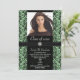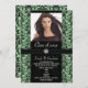 Foto personalizada e texto. Um fundo preto elaborado e ricamente decorado apresenta uma fita e uma imagem de broche de joia facetada que lembra uma decoração feminina antiga.