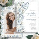 Convite para Graduação de Flor Selvagem Azul. Comemore sua graduação em estilo com este convite de festas elegante, perfeito para mais velho segundos graus e formandos universitários. Apresentando lindas flores de aquarela pintadas à mão, este design apresenta um buquê lateral delicado de rosas azuis, creme e brancas, acentuado com verde-seno-macio de eucalipto verde-macio para um toque rústico mas refinado. A fonte azul-cinza eterno acrescenta um elemento sofisticado, fazer ideal para as celebrações da graduação do primavera e verão. O verso do convite inclui um padrão de coordenação e um espaço dedicado para uma foto carinhada por um solteiro, criando uma manutenção pessoal e na moda. Quer você esteja hospedando uma reunião íntima ou uma grande celebração, este convite define o tom perfeito para um evento inesquecível.