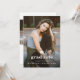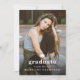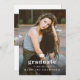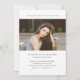 Um convite elegante de graduação com uma grande foto vertical com boné de formatura e texto editável mínimo na frente. A parte de trás tem uma foto horizontal e um local para anunciar o formando e os detalhes da festa.