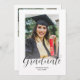 Este convite de graduação de fotos moderno, elegante e na moda apresenta uma foto vertical e um título com um nome de script personalizável e texto na frente. As costas têm um convite com os detalhes da festa. Uma forma excelente de mostrar seu formando. Clique no botão editar para personalizar este design.