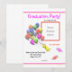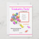 Um jardim de infância ou uma festa de formatura pré-escolar convidando meu trabalho de arte digital de uma galinha fofinha segurando um monte de balões coloridos com bonés de formatura.