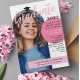 Convite de festa de formatura retrorreflector personalizado com uma foto em forma de arco no cobrir e uma segunda foto cobrindo o verso. Formando escrito em pincel cor-de-rosa através do convite de graduação. Cor rosa pálido e sotaque rosa. Na moda e convite para formatura feminina em rosa, branco e preto.
