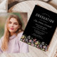 Uma bela borda floral de aquarela de flores silvestres decora a borda inferior deste convite de festa de formatura de vassouras. Personalize o texto branco em um fundo preto, com o nome do formando em script de escrita manual; o ano da escola e da classe em sans serif; e os detalhes de data, local e RSVP na fonte serif. Substitua facilmente a imagem de exemplo no verso por uma foto vertical do seu formando.