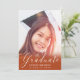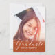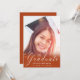 Este moderno e simples anúncio de graduação minimalista e convite de festas inclui sua foto na frente com uma camada de roteiro de caligrafia branca em laranja que lê "Formando" com seu nome e classe/ano para personalizar. A parte de trás do pátio é cor de laranja com texto branco, com toda a sua graduação e informações de festas a serem personalizadas. Desenhada por Susan Coffey.