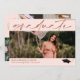 Convite horizontal Elegante para graduação cor-de-rosa com pincel personalizado com uma foto no cobrir e mais três fotos no verso. Convite de formatura de dupla face com fundo de rosa claro. 2 em 1 anúncio de graduação e convite personalizados com fotos e o nome do formando em latão.