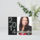Aqui está um convite para festas de formatura ultra ricos, cintilantes e cintilantes com vários embelezamentos digitais deluxe para dar a ilusão de brilho e brilho. Uma foto grande do lado direito parece estar embrulhada com uma fita bonito de brilho metálico prateado amarrada em um arco escuro, ao lado de grandes gemas de diamante de estilo cintilante organizadas para formar letras para 2014 com pequenas cinzas e lampejos de luz. O verso tem duas áreas de fotos adicionais e uma faixa de prata correspondente destacando os detalhes de seu formando.