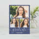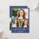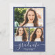 Graduação de fotos da casa aberta com script simples de formando azul e branco. Adicione 4 de suas fotos favoritas com uma elegante caligrafia de script e colagem de grade de fotos.
